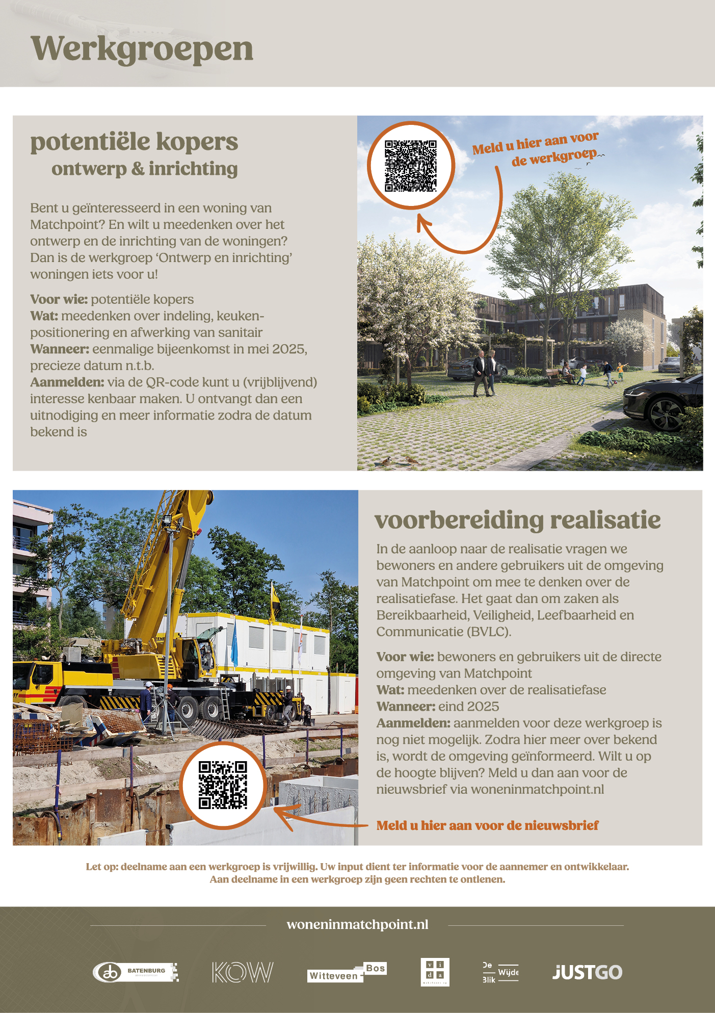Daarnaast was er de mogelijkheid om aan te melden voor de werkgroep ‘Ontwerp en Inrichting Woningen’. In deze werkgroep kunnen potentiële kopers meedenken over de indeling, de positionering van de keuken en de afwerking van het sanitair. Aanmelden is nog steeds mogelijk via het online formulier. Zodra de definitieve datum bekend is, ontvangt u een uitnodiging.